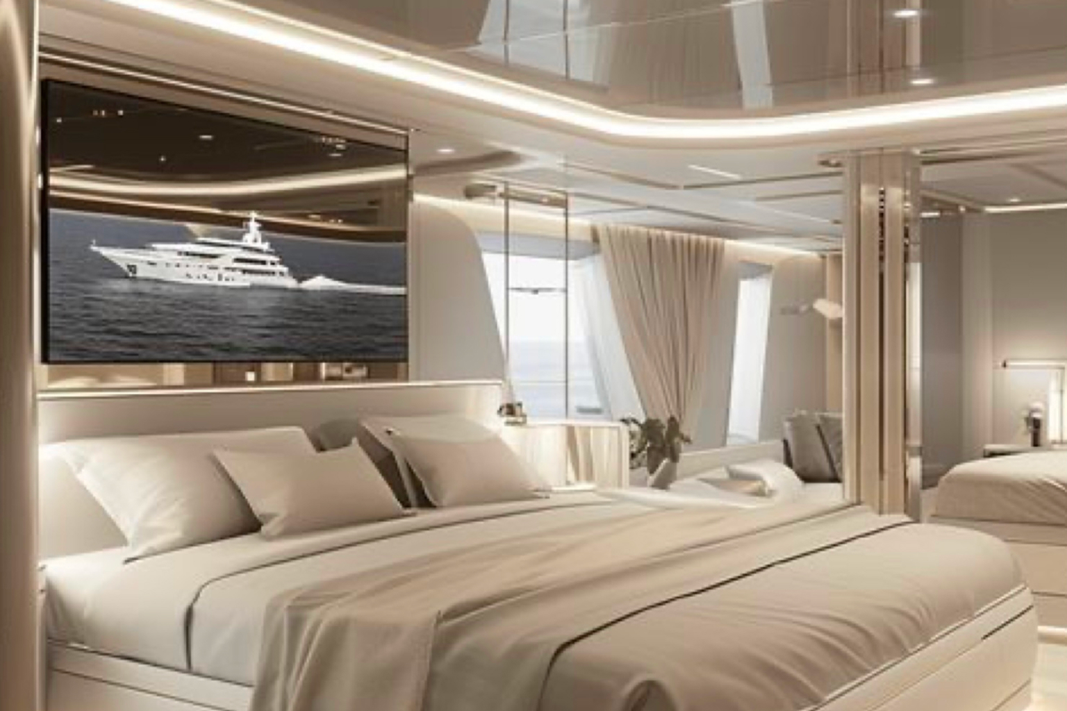 High-resolution stills capture the yacht in its natural context, showcasing details such as material textures, furniture, and lighting atmospheres.